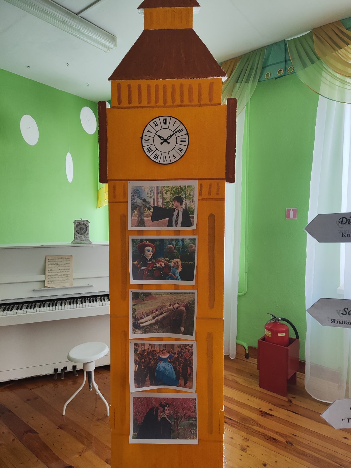 На стенде Биг Бен в холле школы была размещена "кинолента" с фотографиями известных кадров из фильмов, снятых в Великобритании или на английском языке. Учащимся предлагалось отгадать, из каких фильмов эти кадры.