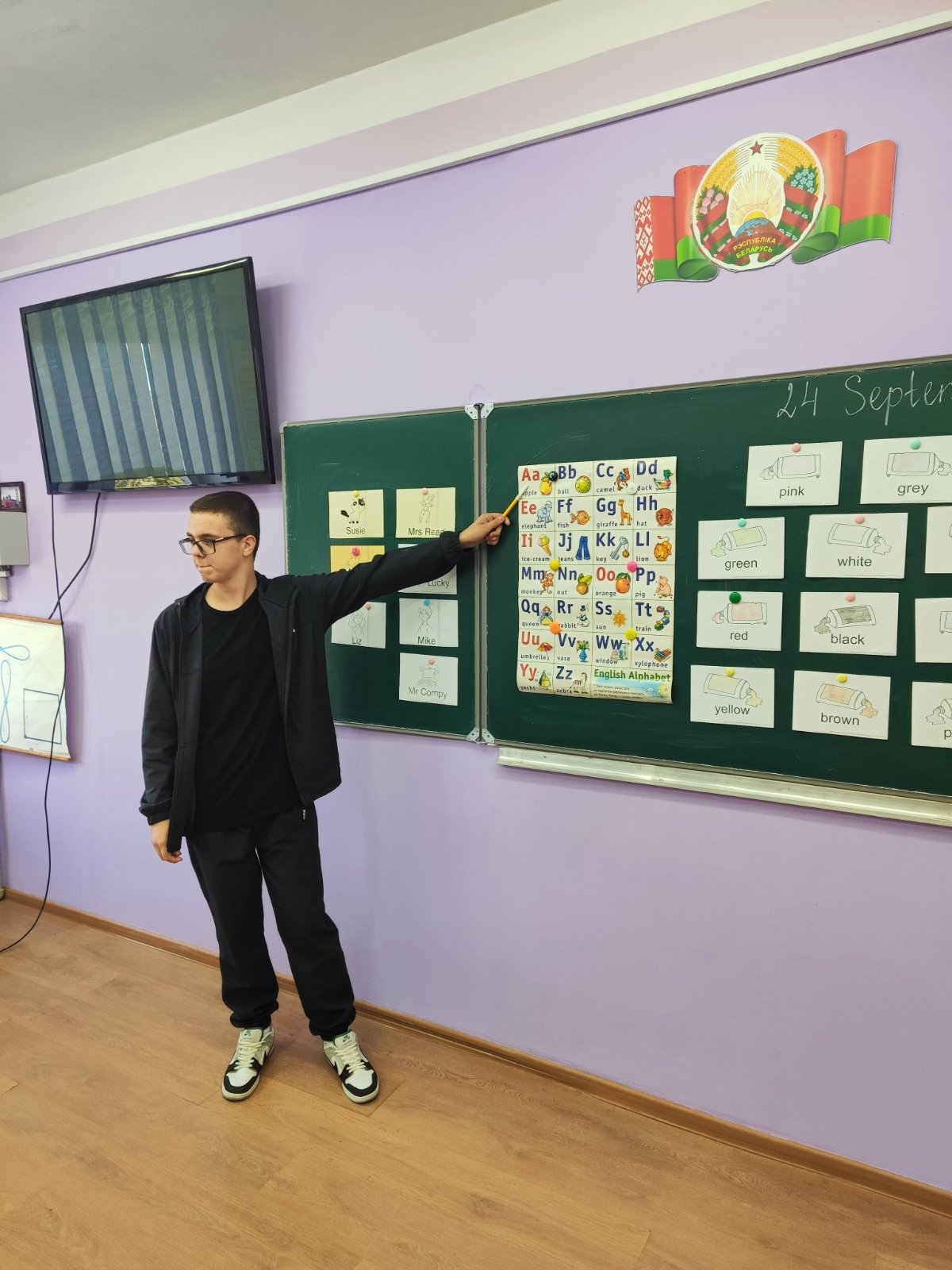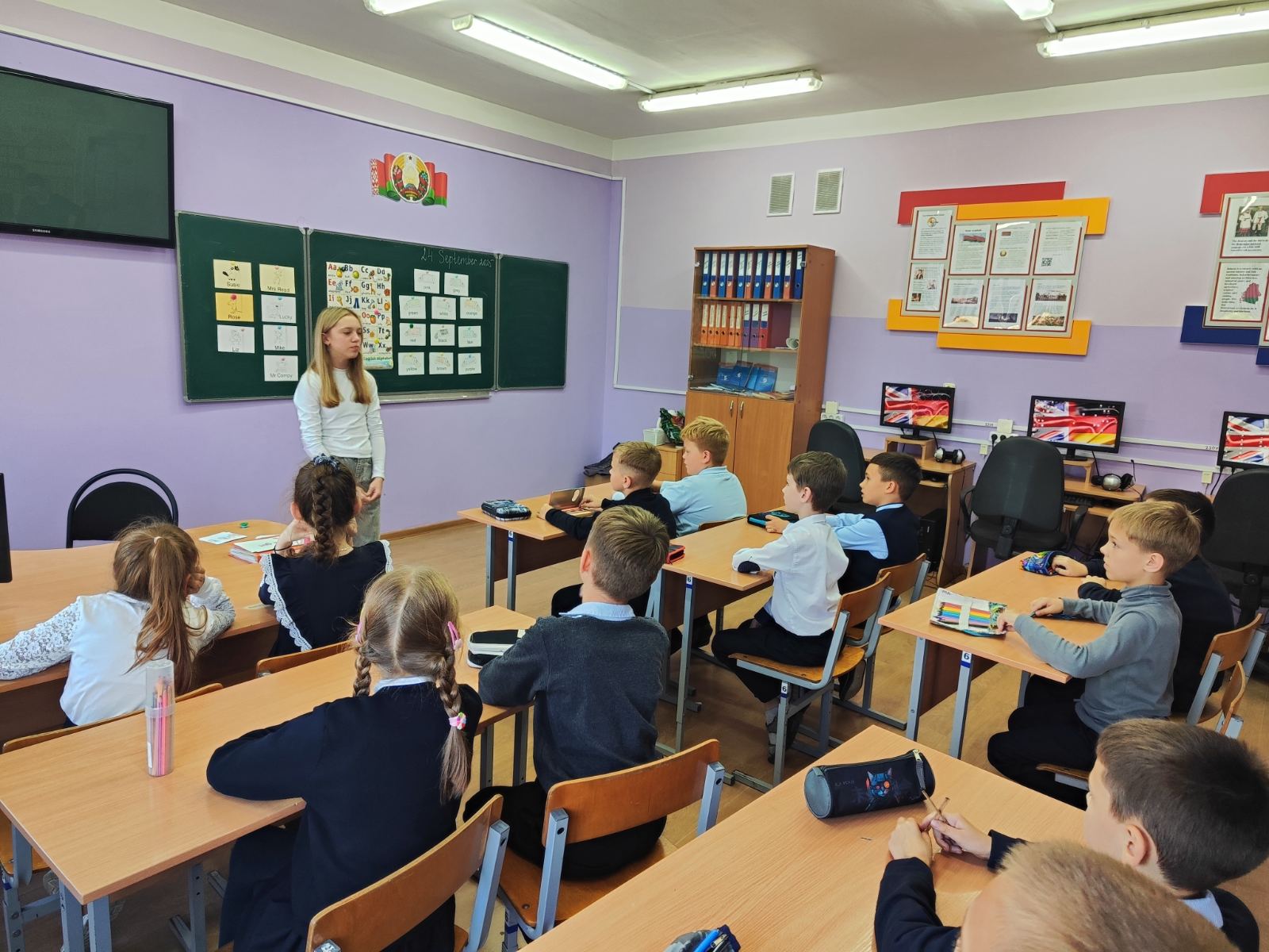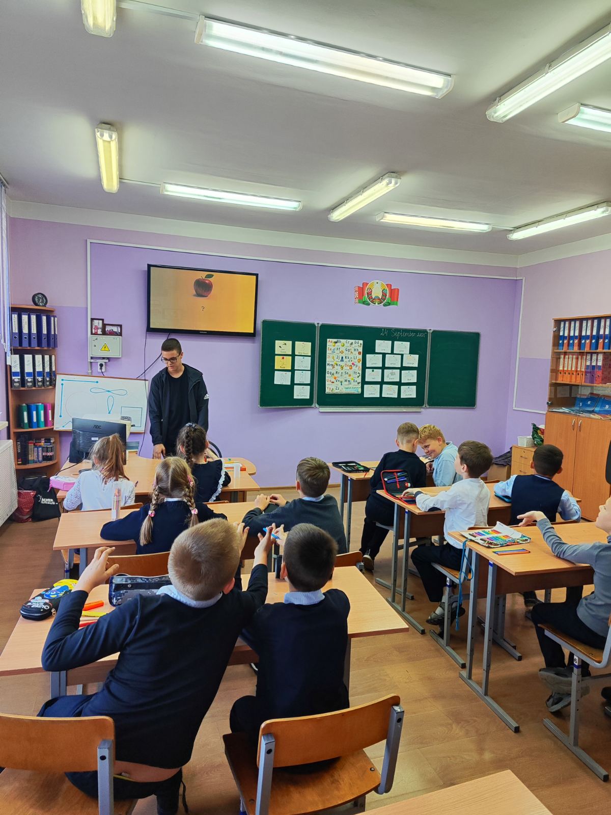 Ребята разработали урок английского языка, направленный на повторение алфавита, цветов, цифр. Урок проведен в игровой форме: разгадывание загадок, выполнение интерактивных заданий, что способствовало активному вовлечению младших школьников в учебный процесс.