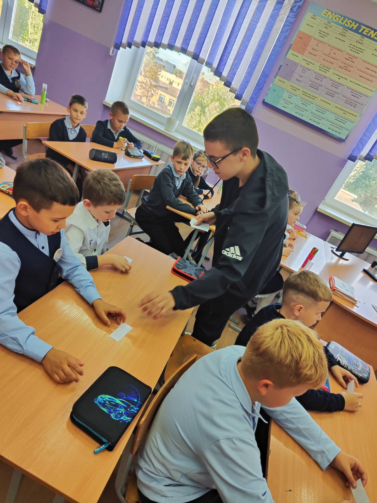 Хорошей традицией стало проведение мероприятий самими учащимися. Ребята 9"А" класса (повышенный уровень) побывали в роли учителя в 4 "В" классе, проведя урок английского языка по теме 'My friend", где организовали работу в группах, придумали интересные онлайн задания, а также задания творческого характера.