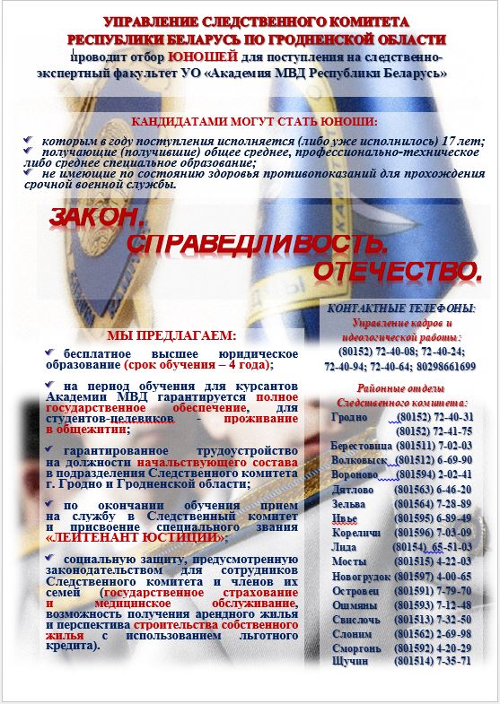 Управление Следственного комитета по Гродненской области проводит отбор ЮНОШЕЙ для поступления на следственно-экспертный факультет учреждения образования «Академия Министерства внутренних дел Республики Беларусь» и юридический факультет учреждения образования «Гродненский государственный университет имени Янки Купалы» на условиях целевой подготовки